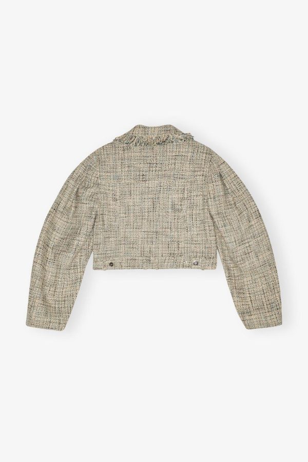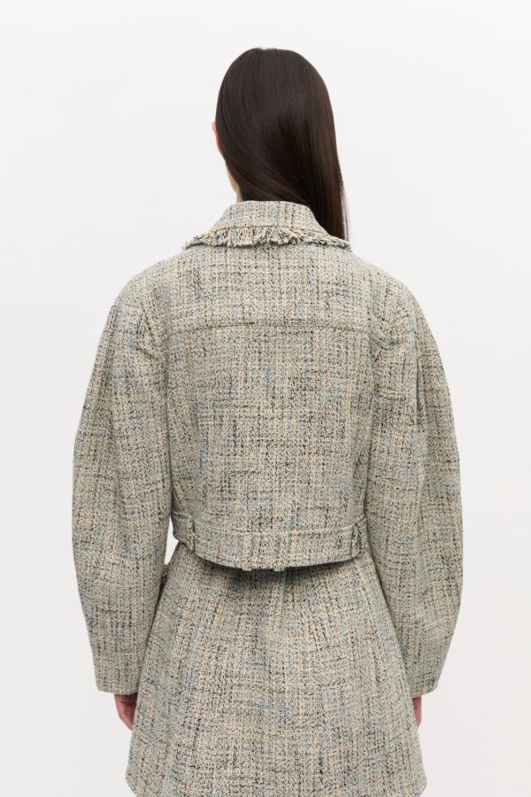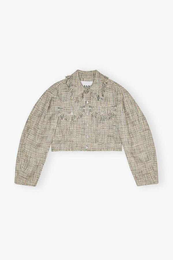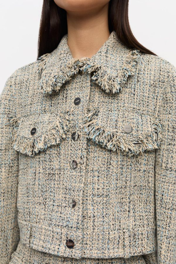 Elevate your outerwear collection with this chic cropped silhouette featuring a sophisticated button-up front. The timeless design showcases a classic collar, functional chest pockets, and eye-catching fringe detailing for a touch of playful elegance.