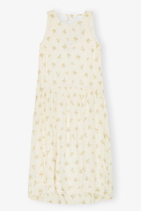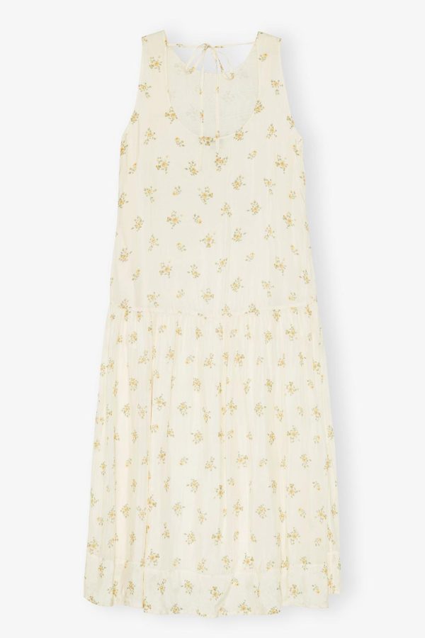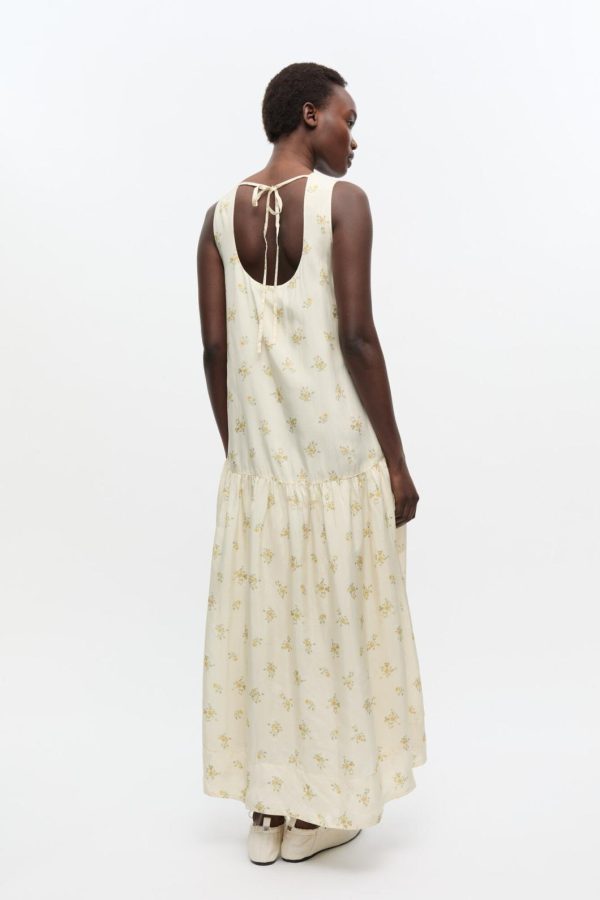 This dress is sleeveless and features a round neckline, tie detail at the back and a dropped waist.