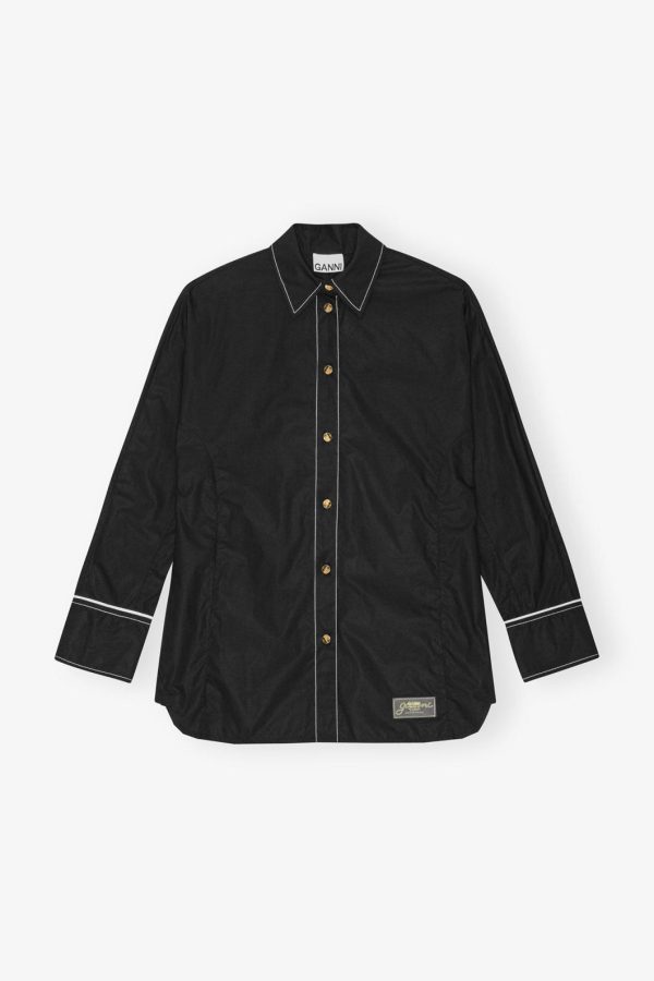This Black Cotton Poplin Raglan Shirt features a collar, a button closure, long sleeves with buttoned cuffs and a sewn-on GANNI logo patch.