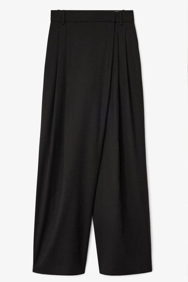 These trousers feature a hook-and-eye closure, belt loops, side pockets and a cross-over front detail.