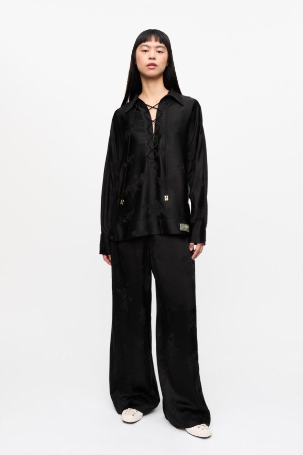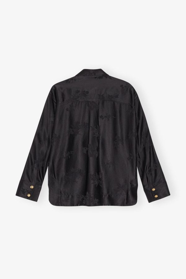 Crafted from a luxurious, soft, flowing fabric with a shiny surface and a delicate jacquard-woven pattern, this Fluid Satin Jacquard Tie-String Raglan Shirt exudes effortless cool. It features buttoned cuffs, curved side slits, and an elegant tie-string detail adorned with a gold-tone metallic GANNI Butterfly logo.