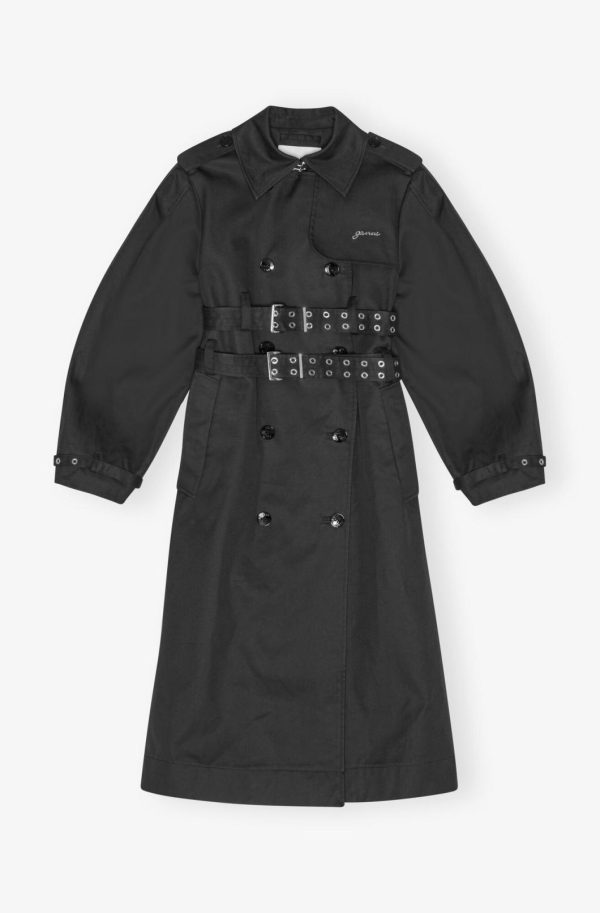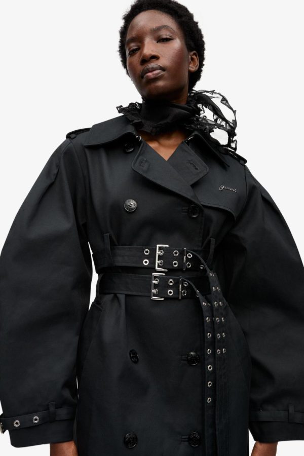 This sophisticated Black Bonded Cotton Trench Coat delivers timeless elegance that transitions effortlessly through every season. Expertly crafted from premium organic cotton, it features a classic double-breasted button closure, signature puff sleeves with elegant curved detailing, an adjustable eyelet belt, distinctive metallic GANNI logo, and two versatile adjustable waist belts that can be removed for different styling options.