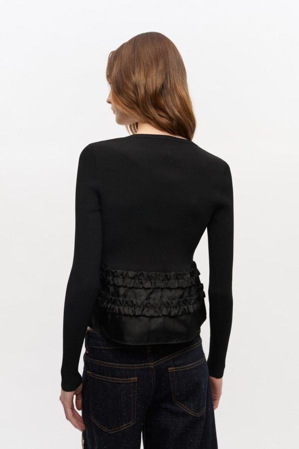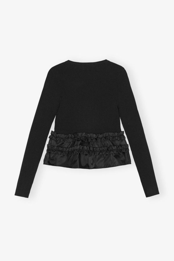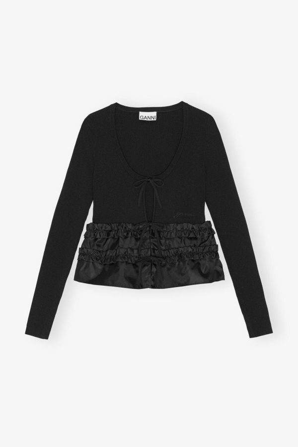 This cardigan features a ribbed knit texture, a tie front closure and a ruffle hem detail in contrasting fabric.