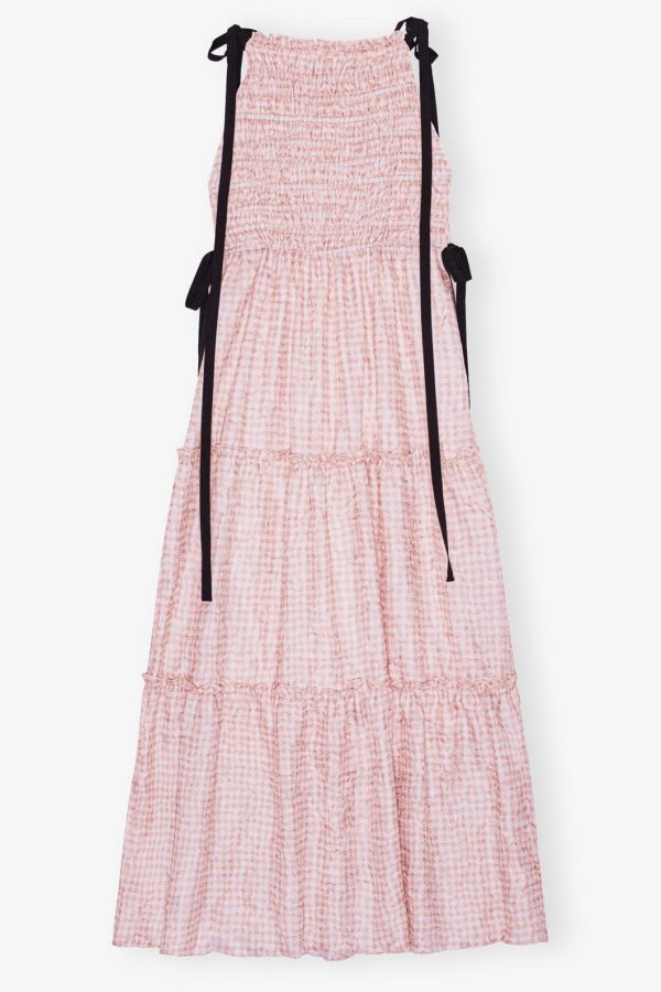 This dress features a textured check print, adjustable black ribbon ties at the shoulders and a tiered skirt.
