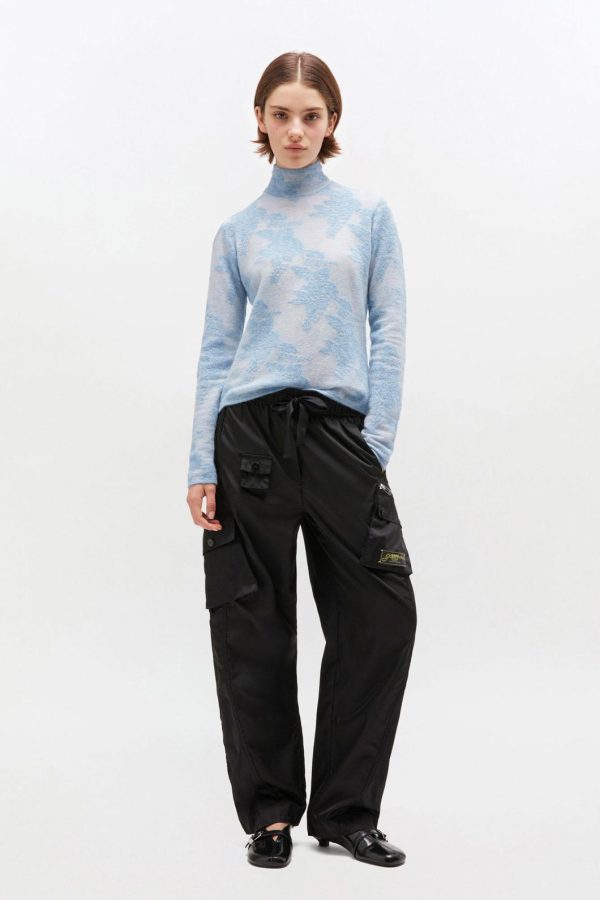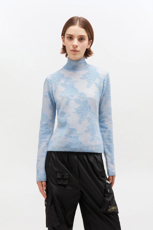 This turtleneck features a sheer flower print, high collar and long sleeves.