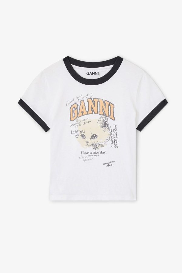 This T-shirt features a round neckline, short sleeves, and a GANNI logo. The T-shirt has a cat print graphic and a ‘Have a nice day! Please recycle’ message.