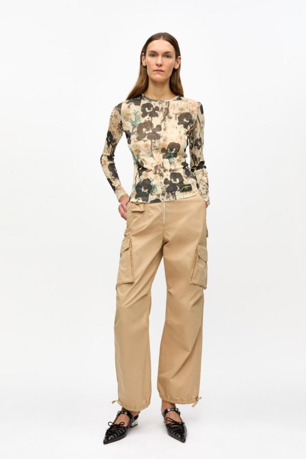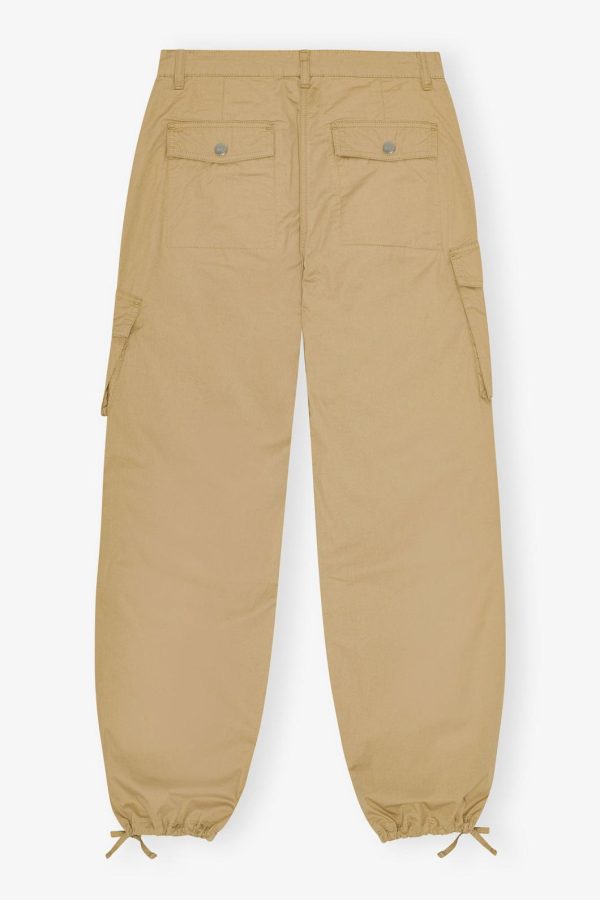 These trousers feature belt loops, a zip and button closure, a small front pocket, two side cargo pockets, back pockets and drawstring at the ankles.