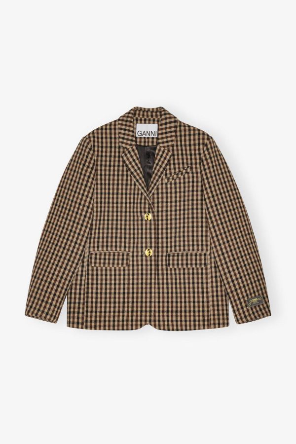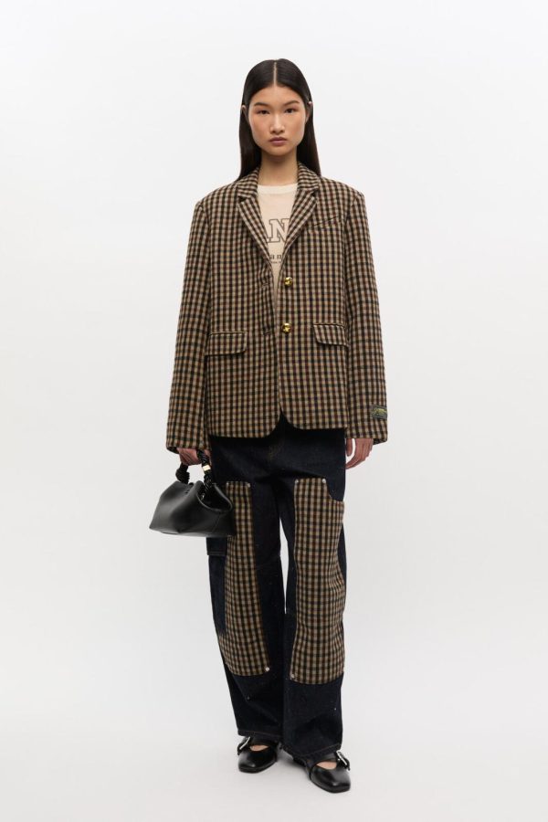 Elevate your wardrobe with this sophisticated check print blazer featuring a classic collar, sharp notched lapels, and a polished 2-button front closure. The signature GANNI logo patch on the sleeve adds a touch of designer elegance.