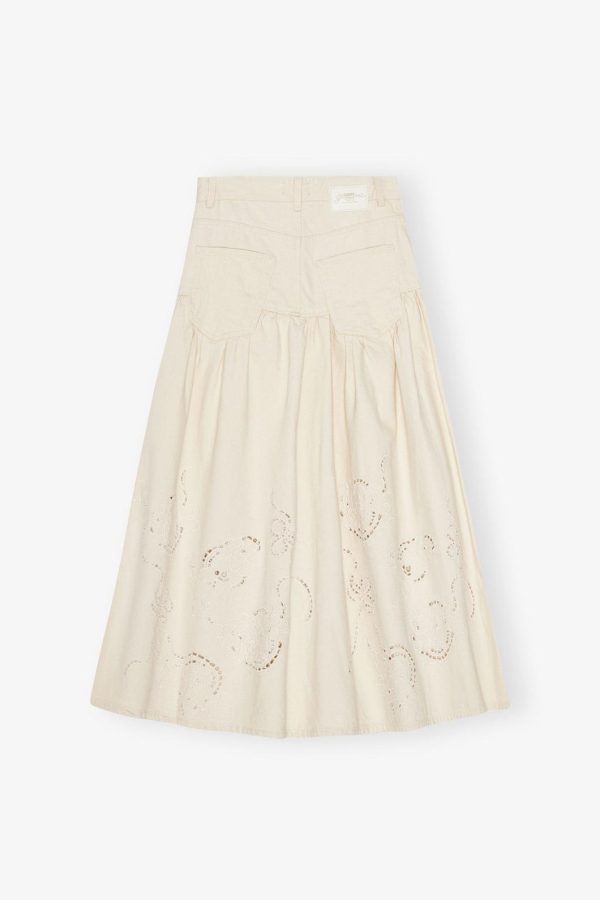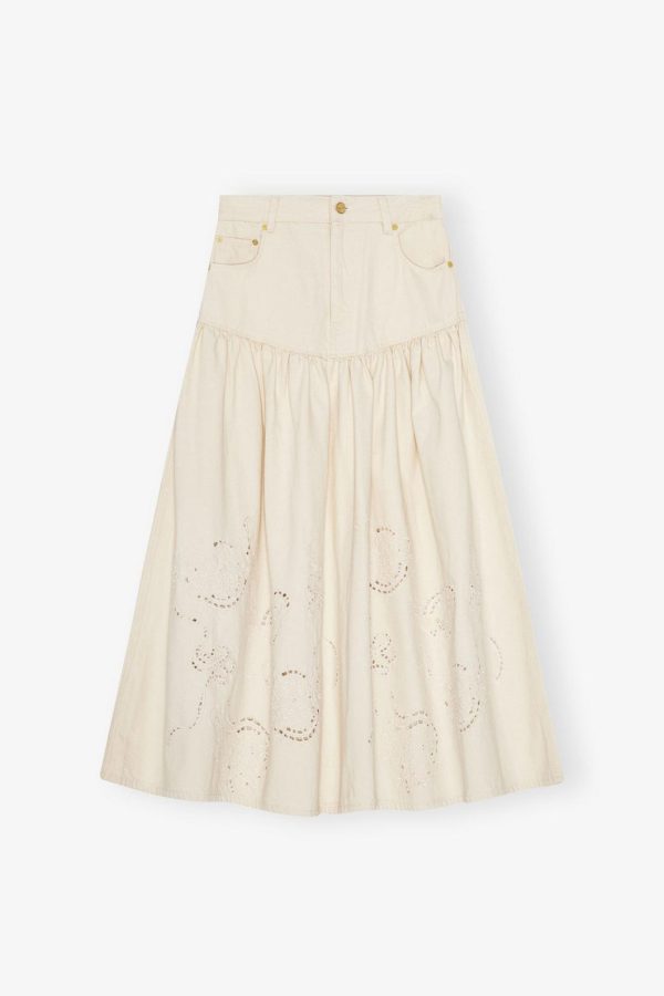 This skirt features feature a zip and button closure, 5 pockets, GANNI logo at the back pocket and broderie anglaise detailing.