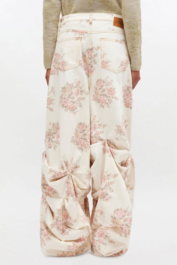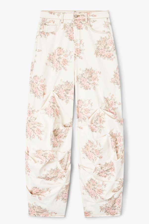 These jeans in floral printed denim feature a zip and button closure, 5 pockets, belt loops, drapey detailing and a GANNI logo patch at back pocket.