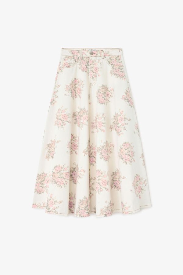 Elevate your wardrobe with this stunning floral printed denim maxi skirt featuring a secure zip and button closure, five functional pockets, convenient belt loops, and a distinctive GANNI logo patch on the back pocket.