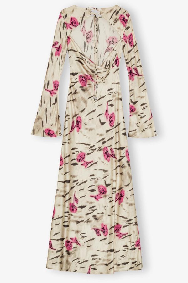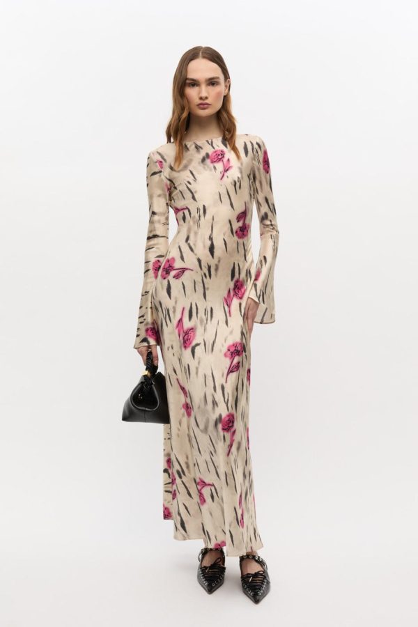 This dress in floral printed stretch satin has a round neck, long sleeves and an open back with tie strings.