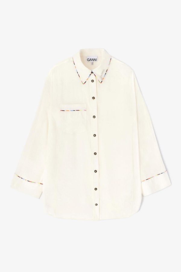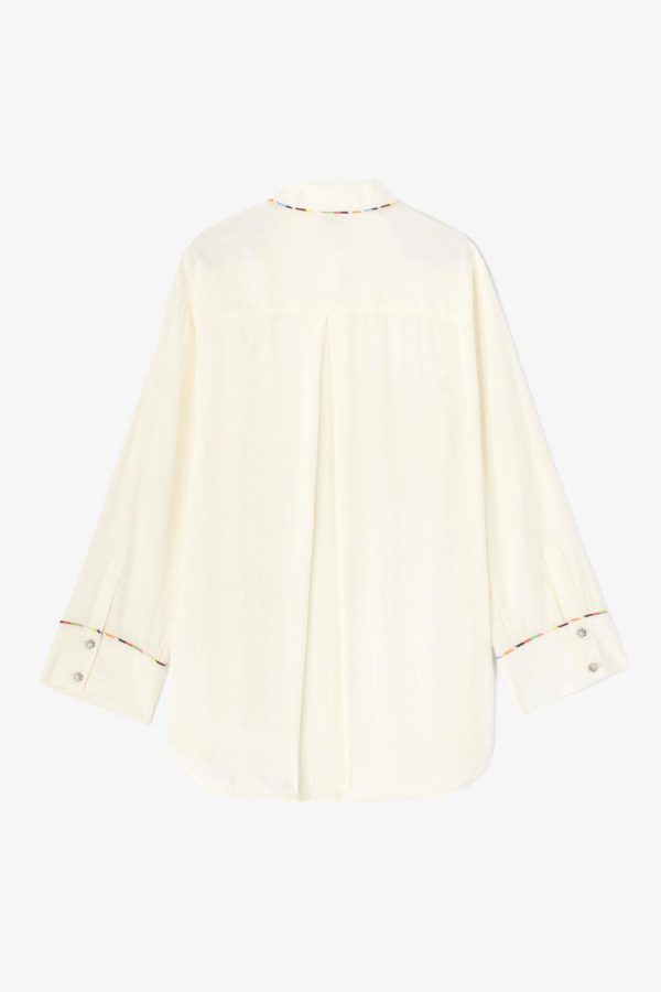 This shirt features long raglan sleeves, a button-up front, and multicolour stitching along the seams.