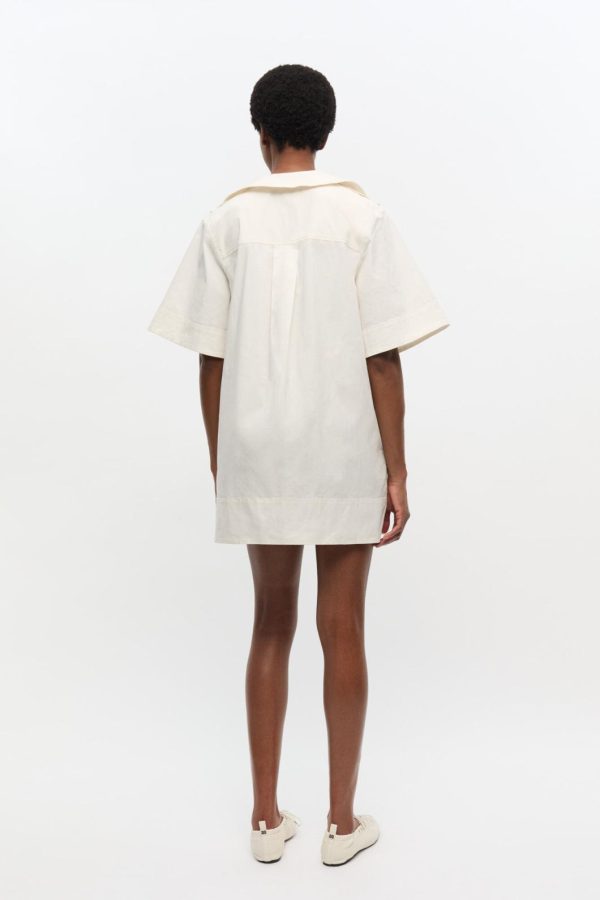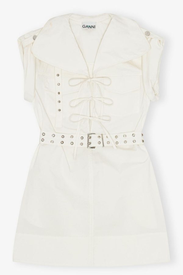 This dress features a deep v-neckline with three ties and a belted waist. The dress has short adjustable sleeves and two front pockets.