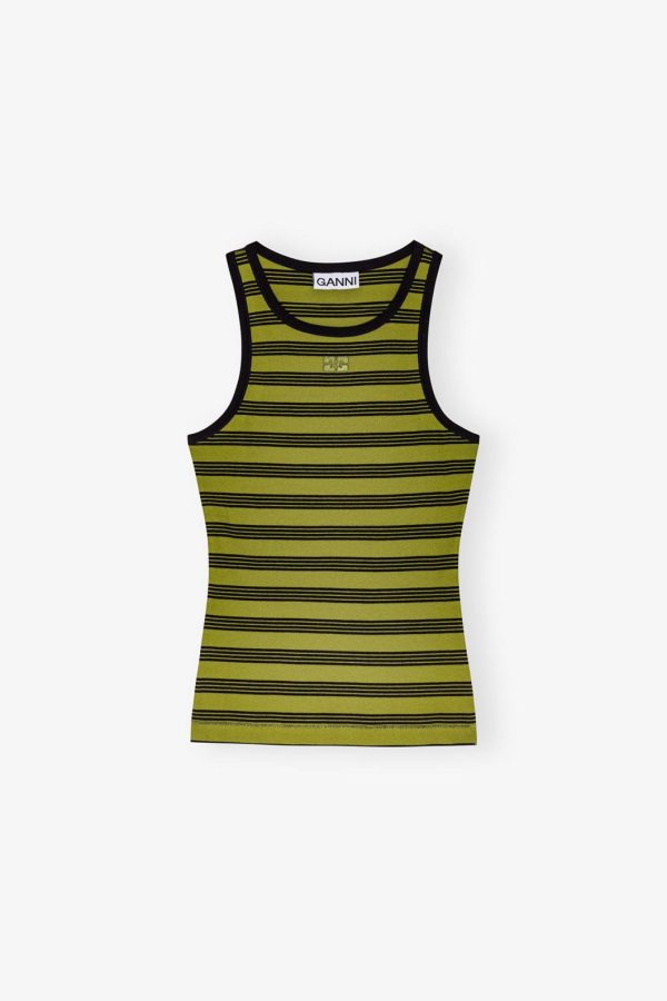 This Striped Soft Cotton Rib Tank Top features a round neckline, tone-on-tone GANNI Butterfly logo and a racerback.