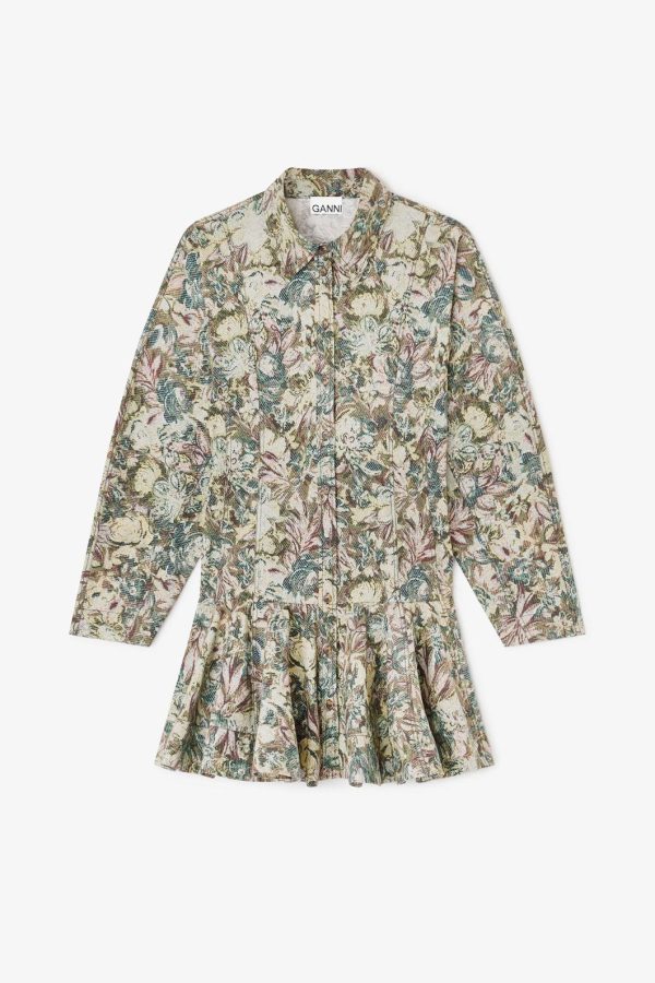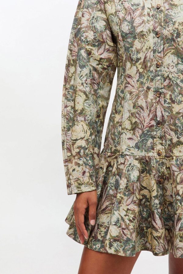 This dress features a tapestry floral print, classic collar, button-front closure, drop waist and ruffled hem detail.