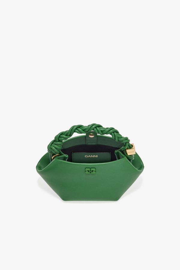 This bag features a tone-on-tone metallic GANNI Butterfly logo, a twisted handle with a braided knot, and a gold-tone metallic dice with a GANNI Butterfly logo engraved. The bag has an internal magnetic closure, a flat card pocket inside, and an adjustable and removable shoulder strap for crossbody wear.