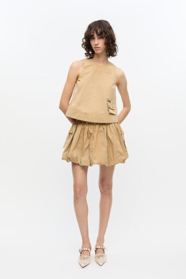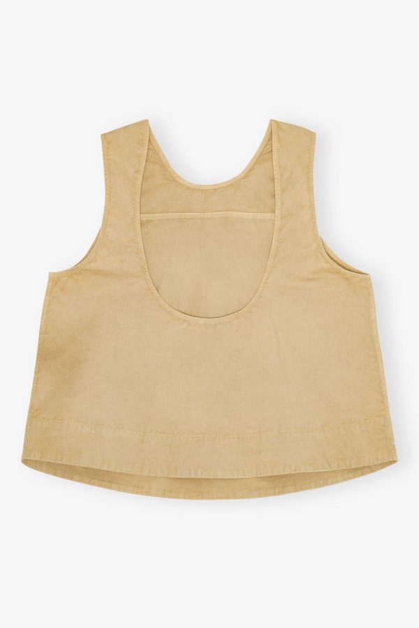 This Beige Washed Stretch Cotton Sleeveless Top is sleeveless and features a round neckline.