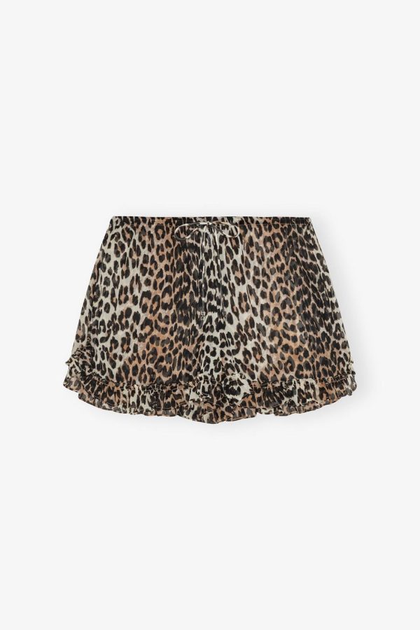 These shorts feature a lightweight chiffon material with a leopard print. They include a ruffled hem and an elastic waistband.