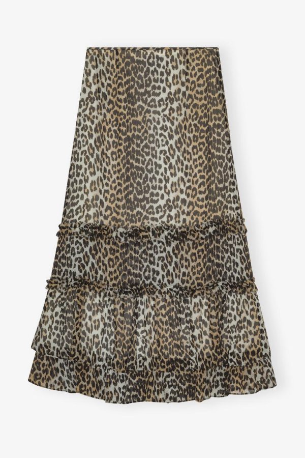 This skirt features a flowing silhouette, layered structure, ruffle details and an all-over leopard print.