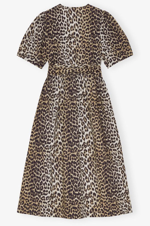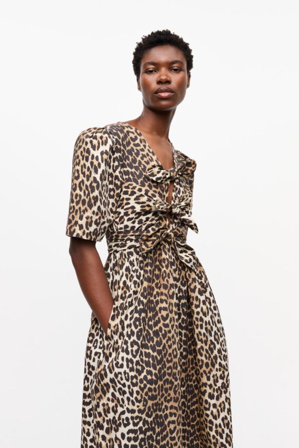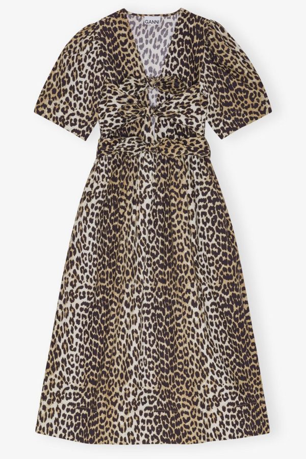 Elevate your wardrobe with this stunning leopard printed cotton midi dress featuring a flattering deep v-neckline, adjustable front tie details, and chic short sleeves for versatile styling.