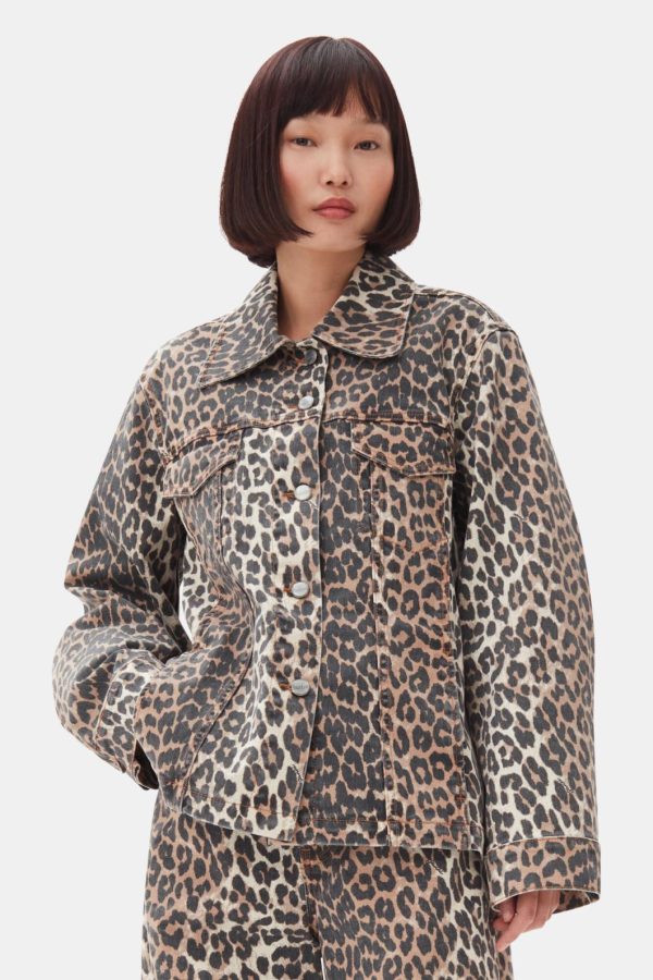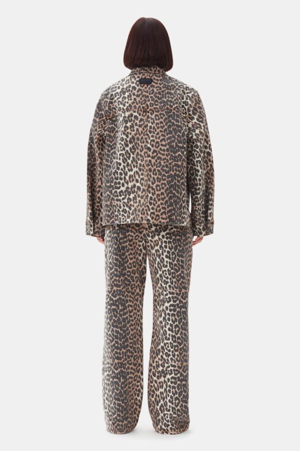Make a bold statement with this eye-catching leopard print denim jacket featuring a classic collar, convenient button closure, multiple functional pockets, and the signature GANNI logo displayed on the back for authentic brand recognition.