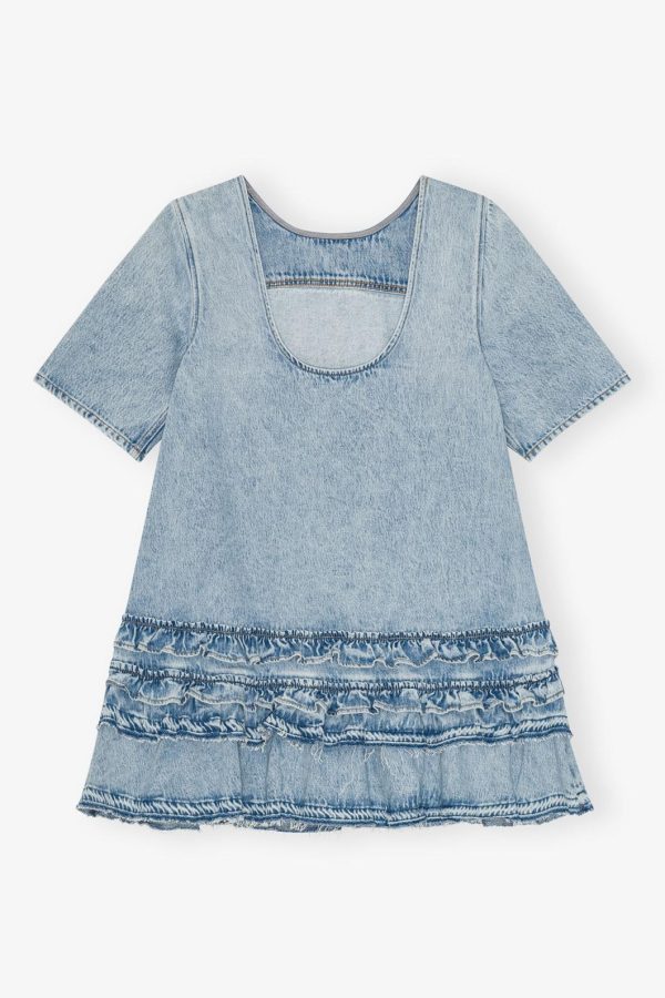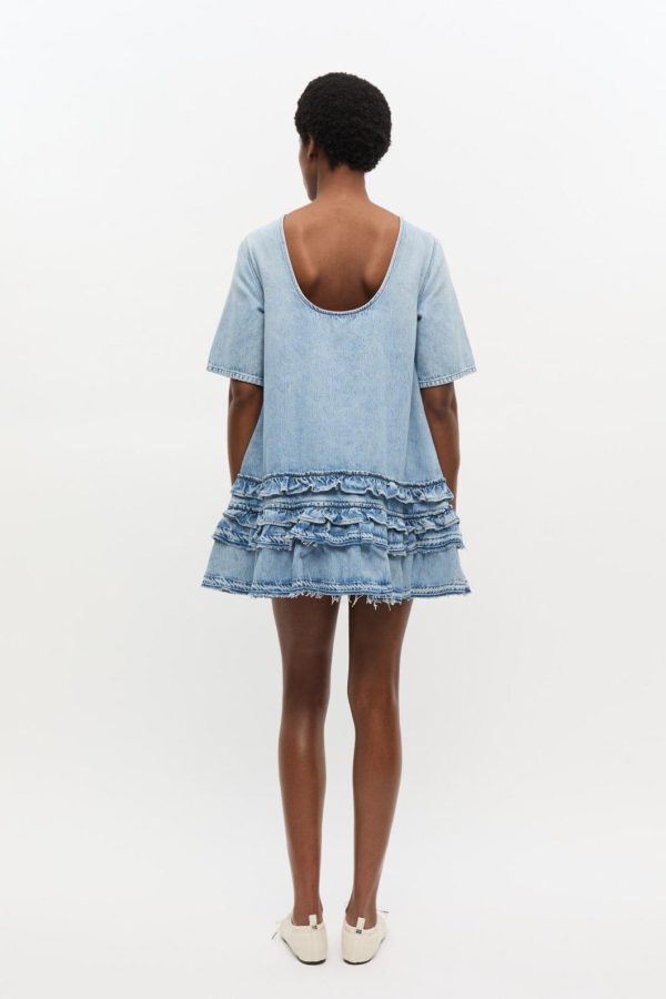 This dress features a round neckline, an open back, short sleeves, frill details and a raw hem.