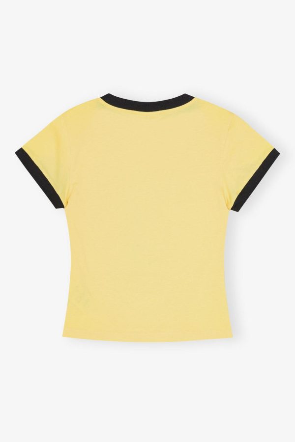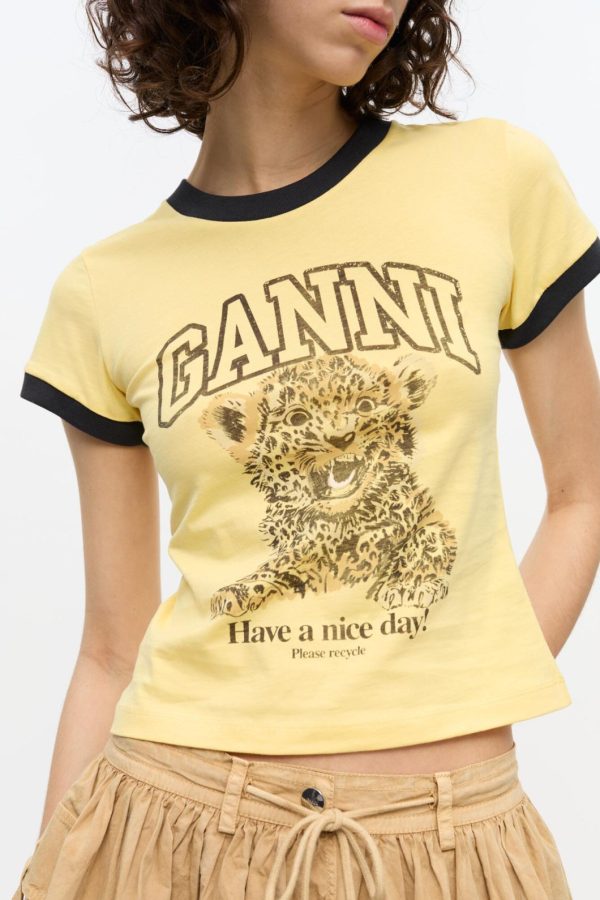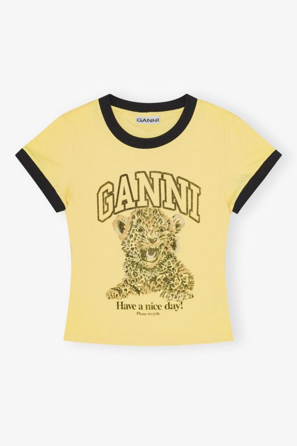 Make a bold statement with this vibrant yellow cropped leopard print t-shirt featuring a classic round neckline, comfortable short sleeves, and the iconic GANNI logo for that perfect street-style edge.