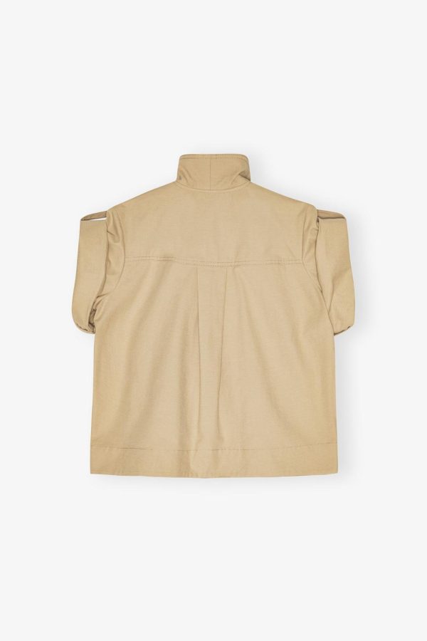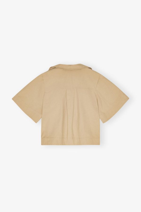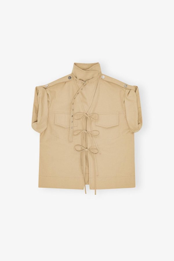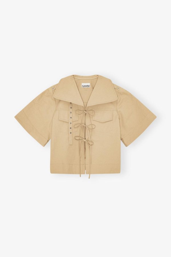 This blouse features a large collar, deep v-neckline with three tie bands at the front and button shoulder details. The blouse has short adjustable sleeves and two front pockets.
