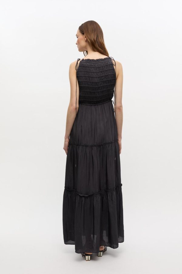 This dress features a smocked texture, tiered skirt design, adjustable straps and a silver-tone GANNI Butterfly logo tie-string finish.