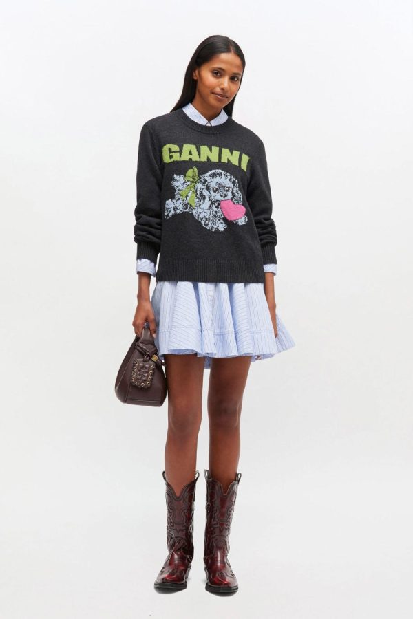 This jumper features a round neckline, long sleeves, ribbed edges, a puppy print graphic and a GANNI logo.
