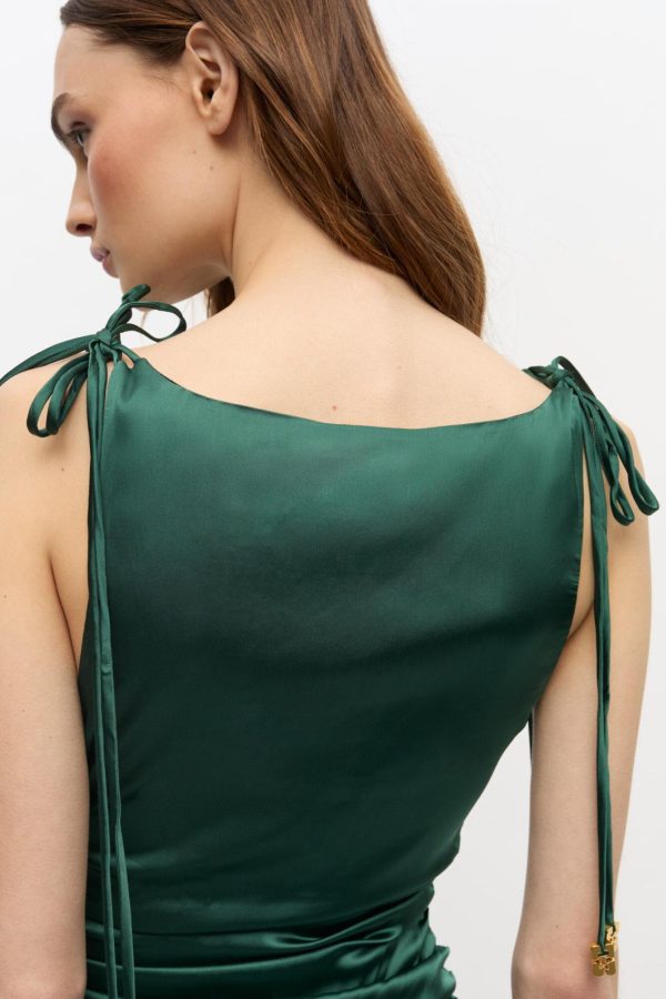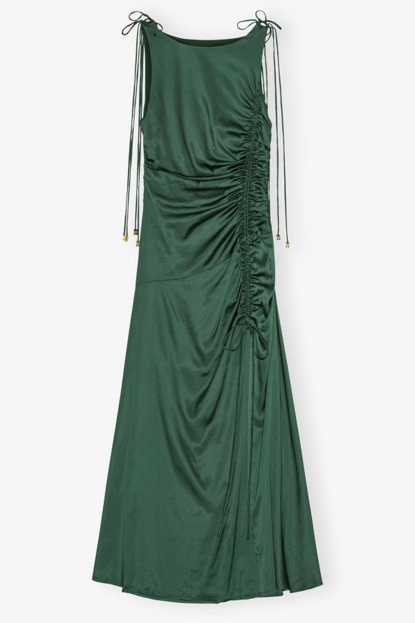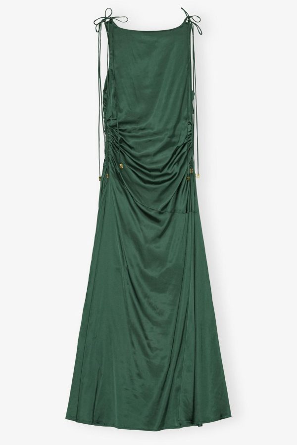 GANNI Pineneedle Green Satin Gathered Dress | Women Dresses