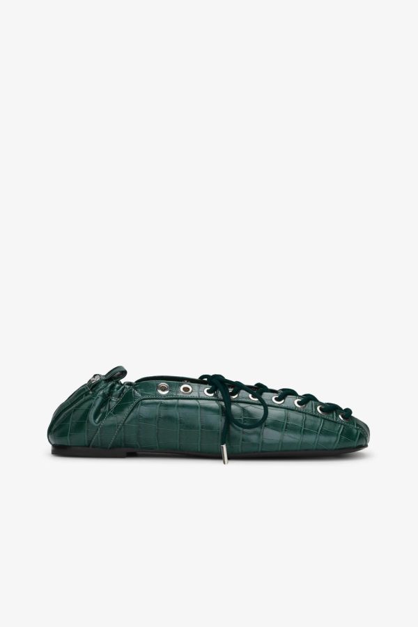 These shoes are crafted from a croc-embossed fabric with a glossy finish, featuring a lace-up design with metallic eyelets. They have a flat sole and a pointed toe.