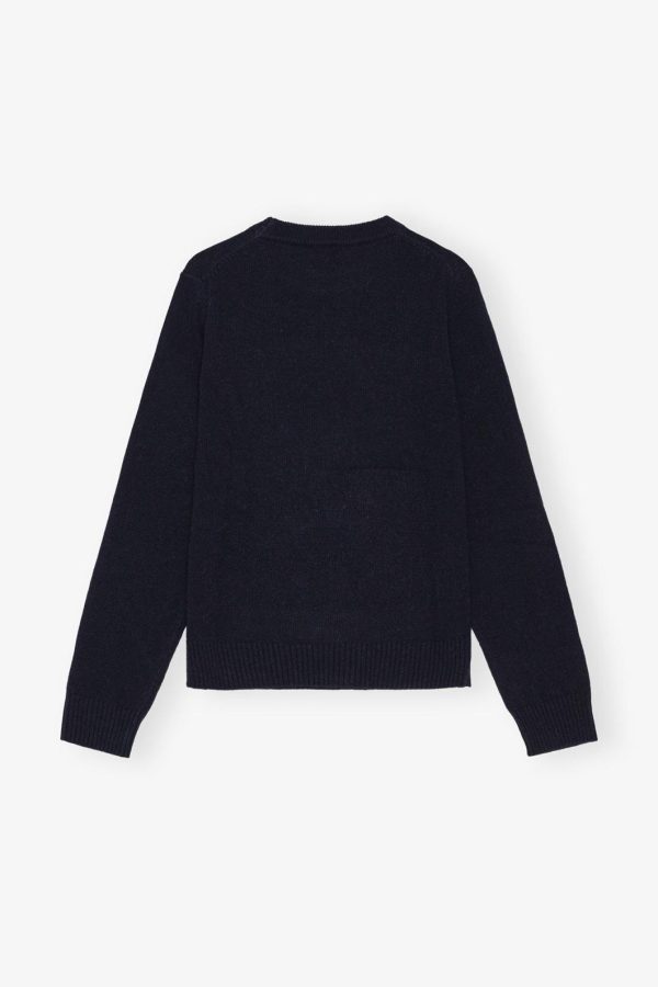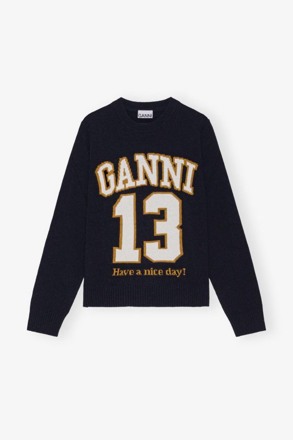 GANNI Sky Captain Dark Blue Graphic Wool Baseball Jumper