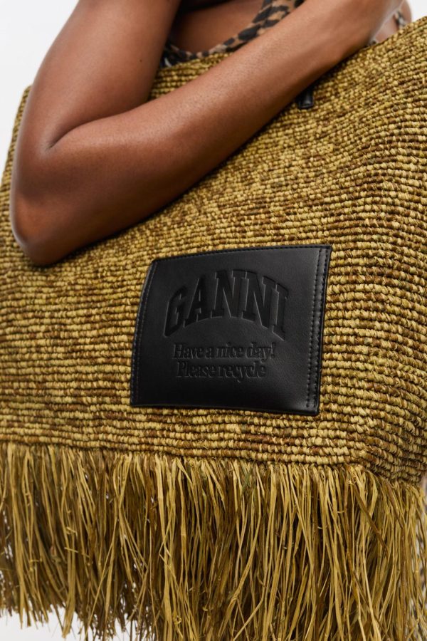 Intricately crafted with raffia, handwoven by female artisans in Madagascar as part of a purpose-driven project supporting over 350 artisans. This bag features adjustable straps, a gold-tone dice with a GANNI Butterfly logo, fringe details, and a zipped flat pouch inside.