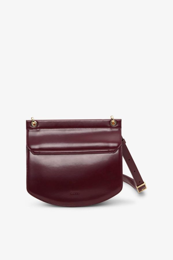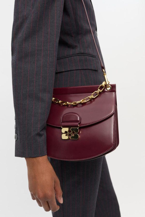 This bag features a structured silhouette, a box chain handle and an adjustable and removable shoulder strap. The bag has a magnetic closure with the signature GANNI Butterfly clasp in gold-tone, three main compartments and a slip pocket.