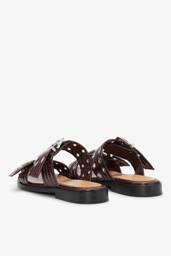 Elevate your warm-weather style with these chic two-strap sandals featuring sleek silver-tone buckles and matching eyelets, perfect for showing off your pedicure with their open-toe design.