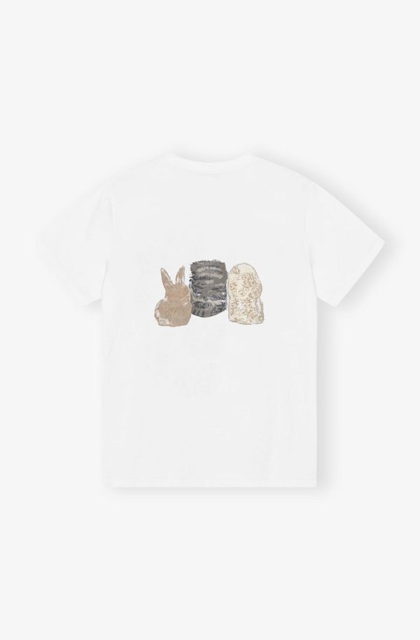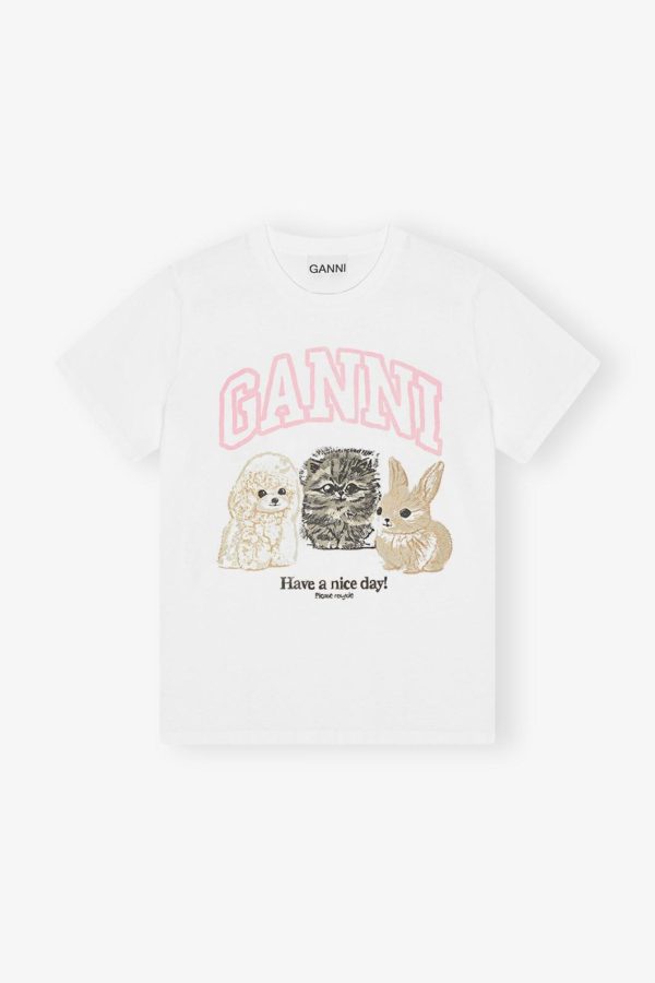 This stylish T-shirt features a classic round neckline, comfortable short sleeves, and the iconic GANNI logo. The eye-catching front graphic showcases a playful animal print design with adorable dog, cat, and rabbit motifs, complete with an uplifting ‘Have a nice day! Please recycle’ sustainability message.
