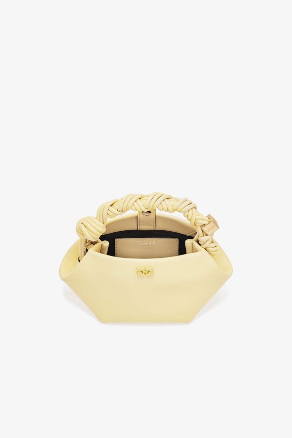 This bag features a tone-on-tone metallic GANNI Butterfly logo, a twisted handle with a braided knot, and a gold-tone metallic dice with a GANNI Butterfly logo engraved. The bag has an internal magnetic closure, a flat card pocket inside, and an adjustable and removable shoulder strap for crossbody wear.